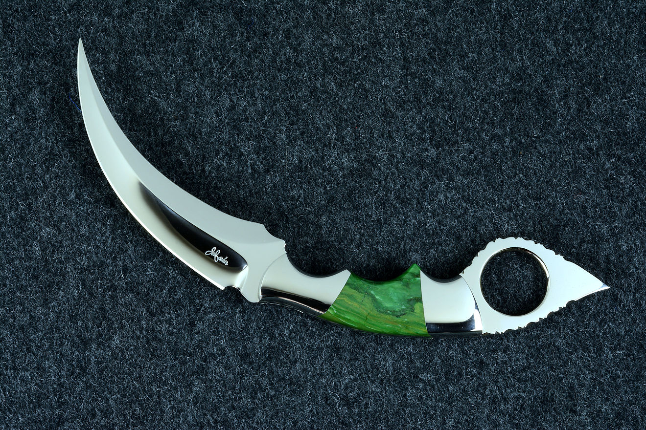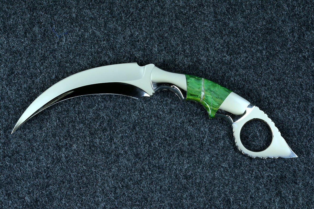 • The steel I chose for this knife is ATS-34 high molybdenum martensitic stainless steel, chosen for its durability and toughness. Because it has high carbon and high molybdenum, this results in profuse molybdenum as well as chromium carbides, and high toughness (resistance to breakage), as well as wear resistance. To bring this steel to its zenith, I used my proprietary T3 deep cryogenic process in heat treating this blade; it's a highly detailed, extremely sophisticated process that takes 33 individual steps and takes over a week long. The result of this is an incredibly wear-resistant blade that has extremely high carbide development, fine grain, and extremely high corrosion resistance. Asperity is reduced; the microstructure development is superior to any other typical handmade knife, and far above any factory or manufactured knife. This is, simply put, ATS-34 at its very finest advanced condition. The convex blade edge grind for this knife blade is hollow, with a very thin and tough cutting edge and an extremely fine point, accomplished with a 3" contact wheel which leaves plenty of thick spine to support the curved blade. Because it's ATS-34, the thin point is resistant to breakage or fracture due to high toughness. The concave blade edge grind is a taper grind, producing a strong and durable edge without sacrificing strength. The blade is mirror polished and I fileworked the knife completely around the spine with a complex vine pattern, including the inside handle curves. The talon at the butt is clean and thick for strength and the finger ring is polished and smooth throughout.