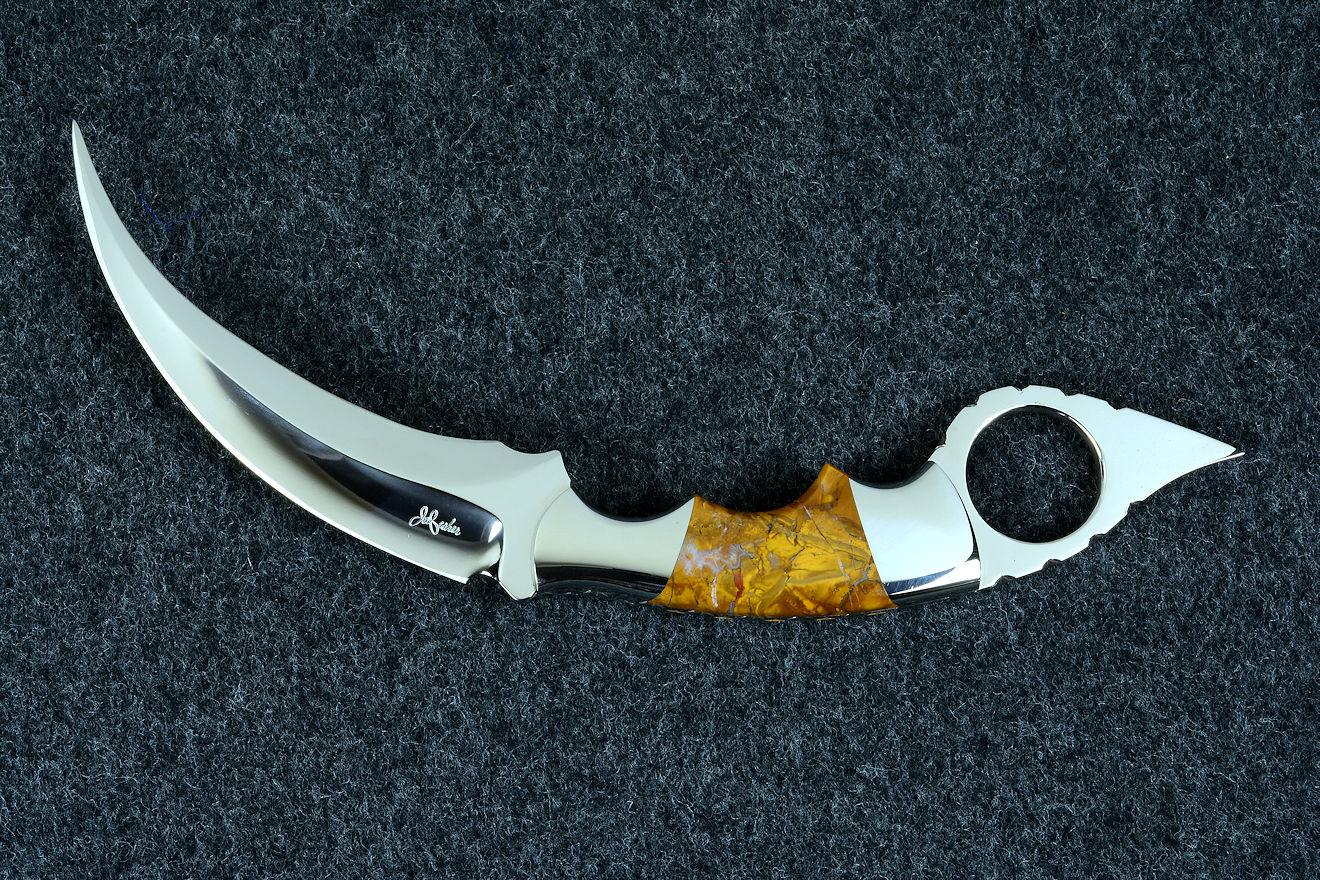 "Raptor" fine handmade custom karambit knife, obverse side view in T3 deep cryogenically treated ATS-34 high molybdenum martensitic stainless steel blade, 304 stainless steel bolsters, Polvadera Agate-Jasper gemstone  handle, leather sheath inlaid with tan rayskin "Raptor" fine handmade custom karambit knife, reverse side view in T3 deep cryogenically treated ATS-34 high molybdenum martensitic stainless steel blade, 304 stainless steel bolsters, Polvadera Agate-Jasper gemstone  handle, leather sheath inlaid with tan rayskin "Raptor" fine handmade custom karambit knife, obverse side view in T3 deep cryogenically treated ATS-34 high molybdenum martensitic stainless steel blade, 304 stainless steel bolsters, Polvadera Agate-Jasper gemstone  handle "Raptor" fine handmade custom karambit knife, reverse side view in T3 deep cryogenically treated ATS-34 high molybdenum martensitic stainless steel blade, 304 stainless steel bolsters, Polvadera Agate-Jasper gemstone  handle "Raptor" fine handmade custom karambit knife, spine filework detail with fully tapered tang and dovetailed bolster and handle scale detail "Raptor" fine handmade custom knife inside handle tang detail showing full filework, contoured bolsters and gemstone handle, dovetailed handle set "Raptor" fine handmade custom karambit, sheathed view in tan rayskin inlaid in 9-10 oz. leather shoulder, stainless steel snap and heavy nylon stitching "Raptor" fine handmade custom karambit knife, 6X enlargement of Polvadera jasper-agate gemstone handle "Raptor" fine custom handmade karambit knife, 6 power enlargement of Polvadera Jasper-Agate gemstone handle, note crystal pockets and colorful complexity "Raptor" fine handmade custom karambit knife, double edged, maker's mark highlight, in ATS-34 stainless steel, 304 stainless steel bolsters, and Polvadera Jasper gemstone handle