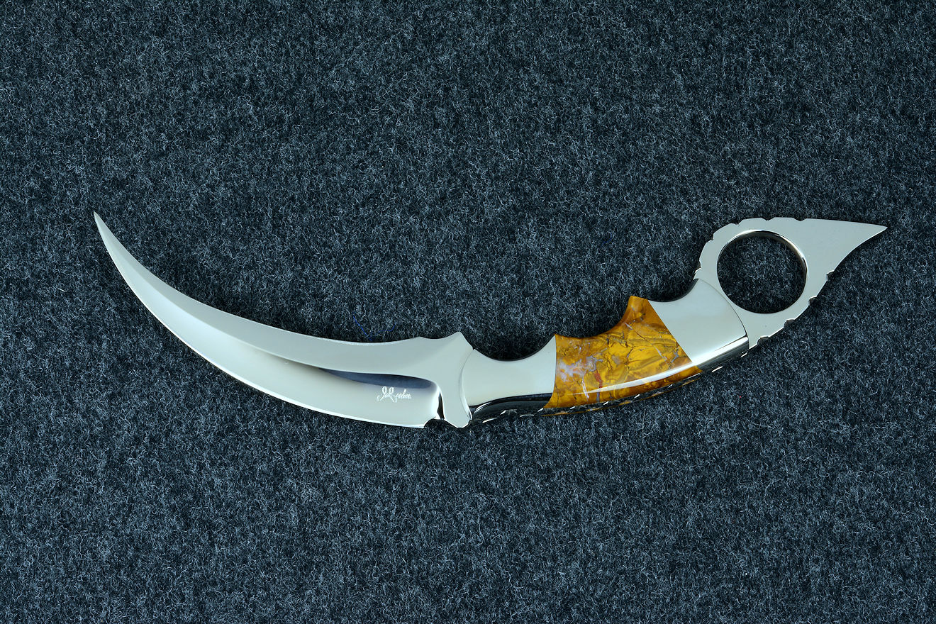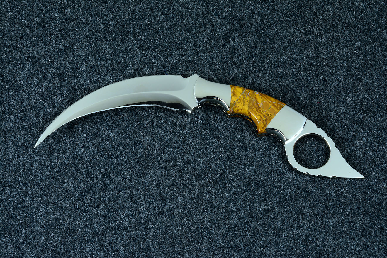 • The steel I chose for this knife is ATS-34 high molybdenum martensitic stainless steel, chosen for its durability and toughness. Because it has high carbon and high molybdenum, this results in profuse molybdenum as well as chromium carbides, and high toughness (resistance to breakage), as well as wear resistance. To bring this steel to its zenith, I used my proprietary T3 deep cryogenic process in heat treating this blade; it's a highly detailed, extremely sophisticated process that takes 33 individual steps and takes over a week long. The result of this is an incredibly wear-resistant blade that has extremely high carbide development, fine grain, and extremely high corrosion resistance. Asperity is reduced; the microstructure development is superior to any other typical handmade knife, and far above any factory or manufactured knife. This is, simply put, ATS-34 at its very finest advanced condition. The convex blade edge grind for this knife blade is hollow, with a very thin and tough cutting edge and an extremely fine point, accomplished with a 3" contact wheel which leaves plenty of thick spine to support the curved blade. Because it's ATS-34, the thin point is resistant to breakage or fracture due to high toughness. The concave blade edge grind is a taper grind, producing a strong and durable edge without sacrificing strength. The blade is mirror polished and I fileworked the knife completely around the spine with a "sunrise" pattern, including the inside handle curves. The talon at the butt is clean and thick for strength and the finger ring is polished and smooth throughout.