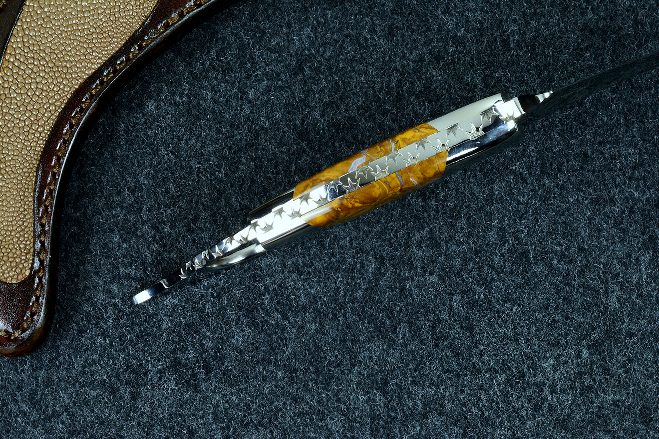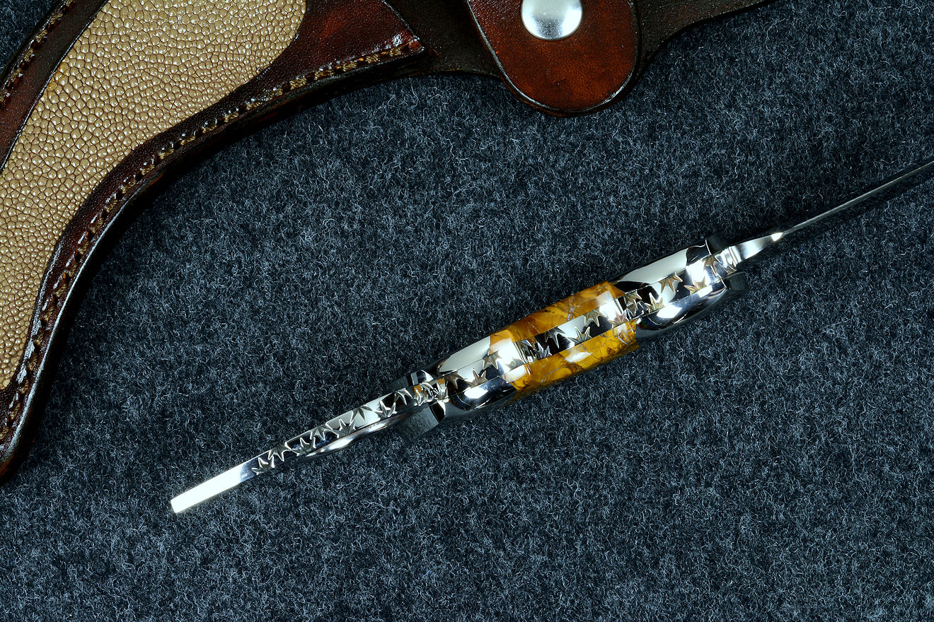• The handle scales of this knife are a bold pair of Polvadera Jasper-Agate gemstones, from a find in the Polvadera hills in south-central Socorro County, New Mexico. This was a singular find of stone, one that I'll probably never come across again. This is a jasper, a cryptocrystalline quartz, with striking colors in tans and golds and warm yellows, and hints of red with clear white agate areas throughout, with numerous crystal lined pockets. It's a very hard stone, taking a bright glassy polish and it will outlast the knife. This is a stone that becomes more complex the closer you examine it; please enjoy the enlargements below.