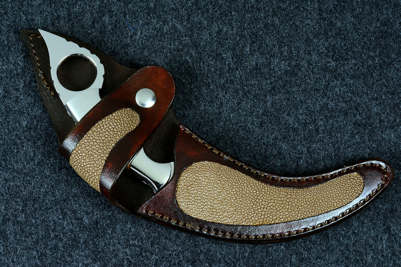 • Sheath: The sheath for a radically curved form like the Raptor is a challenge to create. I made this one in 9-10 oz. leather shoulder, and stitched it with heavy #346 nylon thread throughout including the wide belt loop. I inlaid the sheath with tan rayskin, which is interlocking bone and very tough and durable. There are inlays in the front, the back, and in the belt loop. The dot snap is in marine-grade stainless steel for zero corrosion concerns. Because of the curve of the blade, the knife has to be "rolled" into the heavy welt-protective pocket following the curve of the spine. The sheath is sealed with saddle lacquer for longevity.