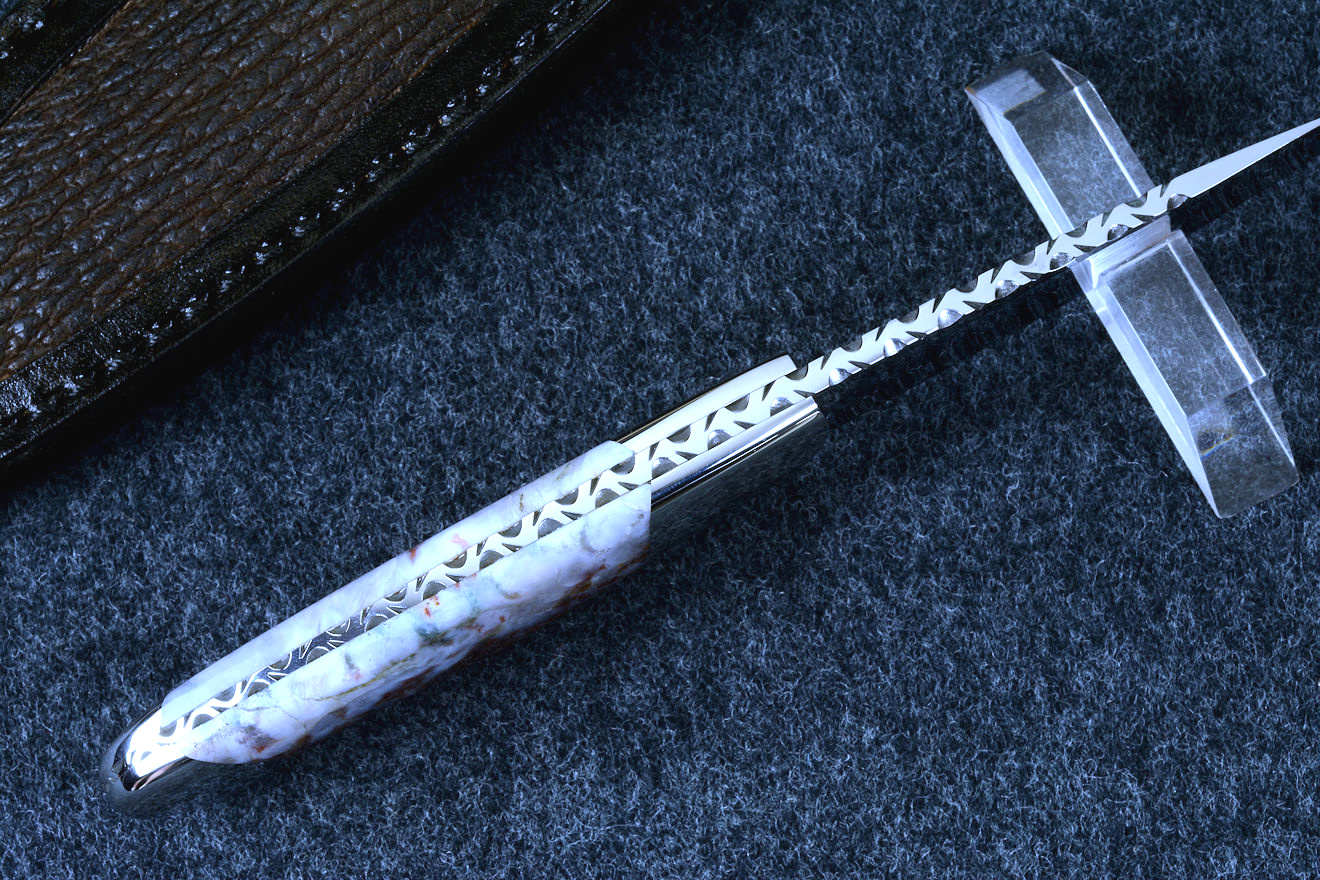 "Temno" fine handmade knife in T3 deep cryogenically treated ATS-34 high molybdenum martensitic stainless steel blade, 304 stainless steel bolsters, Bay of Fundy flame agate gemstone handle, shark skin inlaid in leather sheath "Temno" fine handmade knife, sheathed view in panel inlaid shark skin in 9-10 oz. leather shoulder, nylon thread "Temno" fine handmade knife, reverse side view in T3 deep cryogenically treated ATS-34 high molybdenum martensitic stainless steel blade, 304 stainless steel bolsters, Bay of Fundy flame agate gemstone handle, shark skin inlaid in leather sheath "Temno" fine handmade knife, spine detail view showing full filework, tapered tang and dovetailed gemstone and bolster fittings "Temno" fine handmade knife inside handle detail showing contoured gemstone and bolsters, full filework, fully tapered tang "Temno" obverse side view with maker's mark, in ATS-34 high molybdenum stainless steel blade, 304 stainless steel bolsters, Bay of Fundy flame agate gemstone handle "Temno" obverse side view with maker's mark, in ATS-34 high molybdenum stainless steel blade, 304 stainless steel bolsters, Bay of Fundy flame agate gemstone handle "Temno" reverse side view with maker's mark, in ATS-34 high molybdenum stainless steel blade, 304 stainless steel bolsters, Bay of Fundy flame agate gemstone handle "Temno" reverse side view with maker's mark, in ATS-34 high molybdenum stainless steel blade, 304 stainless steel bolsters, Bay of Fundy flame agate gemstone handle "Temno" reverse side gemstone handle detail, note the flames of carmine red in lavender-tinted white agate and numerous fossil forms in this 6 power enlargement "Temno" obverse side gemstone handle 6X enlargement, note billowing flames of carmine colored agate and white fossil forms in this hard and striking gemstone
